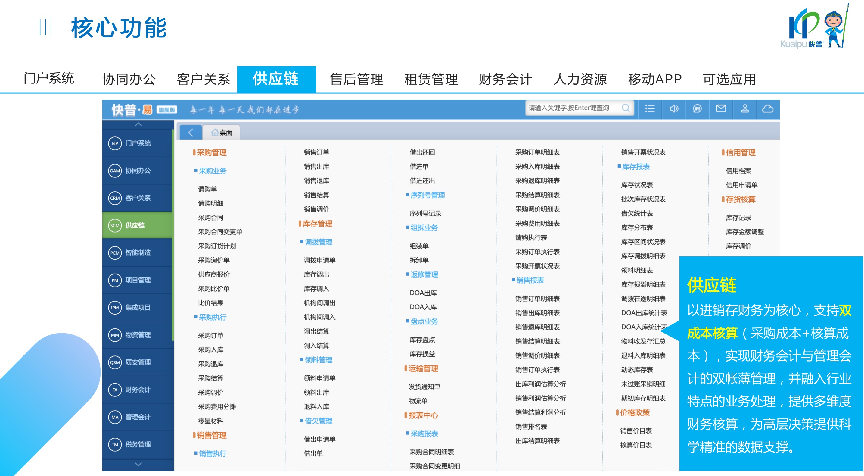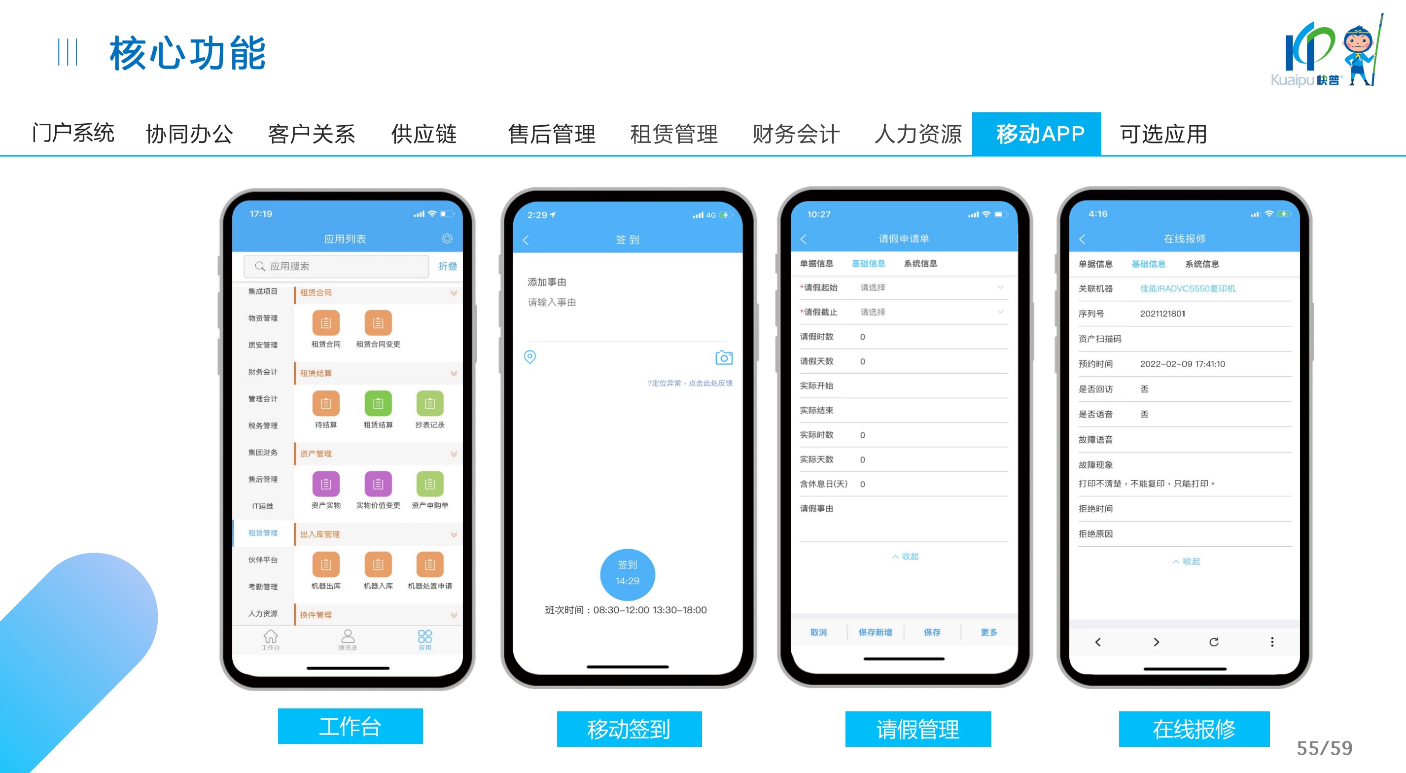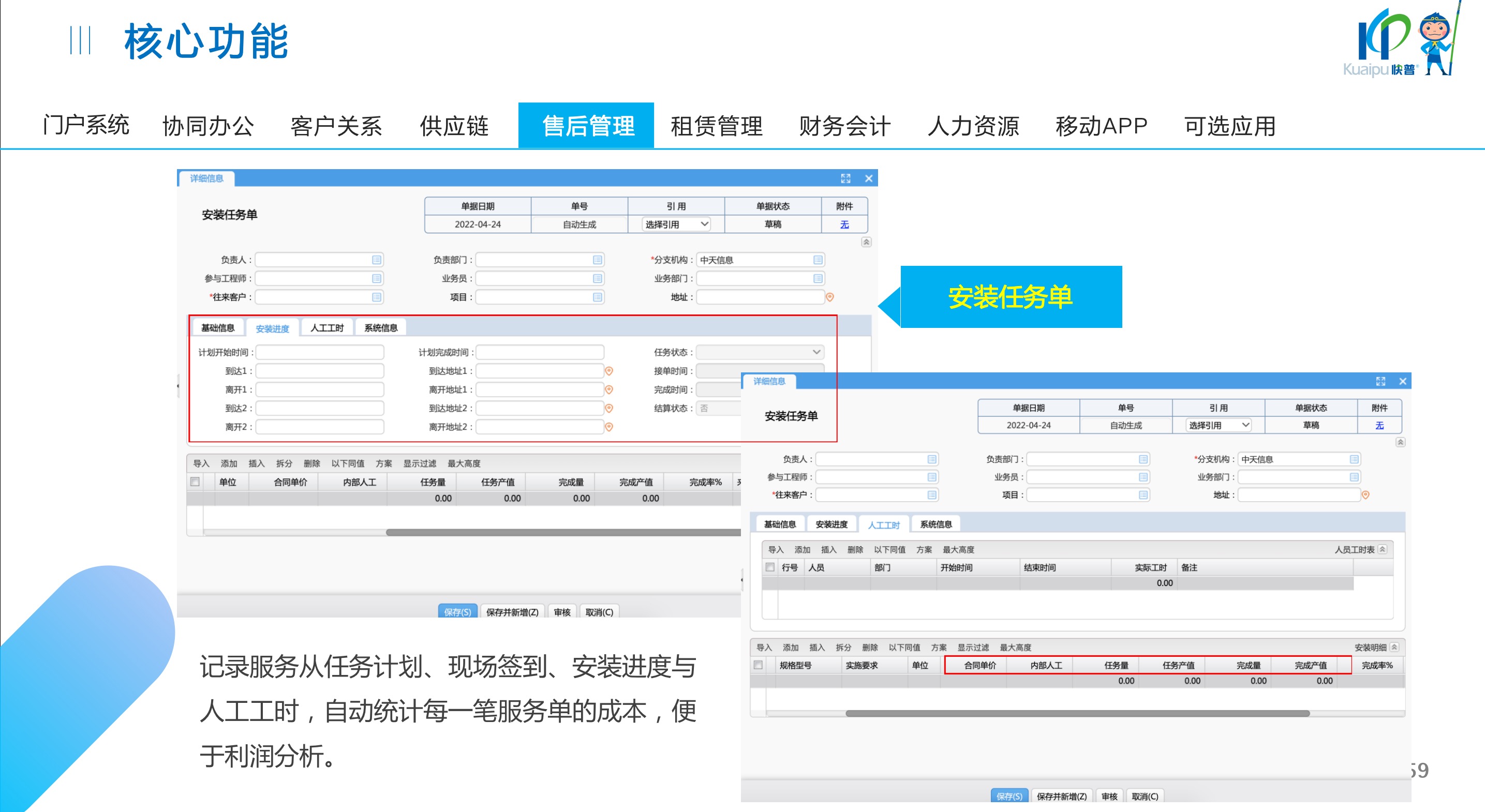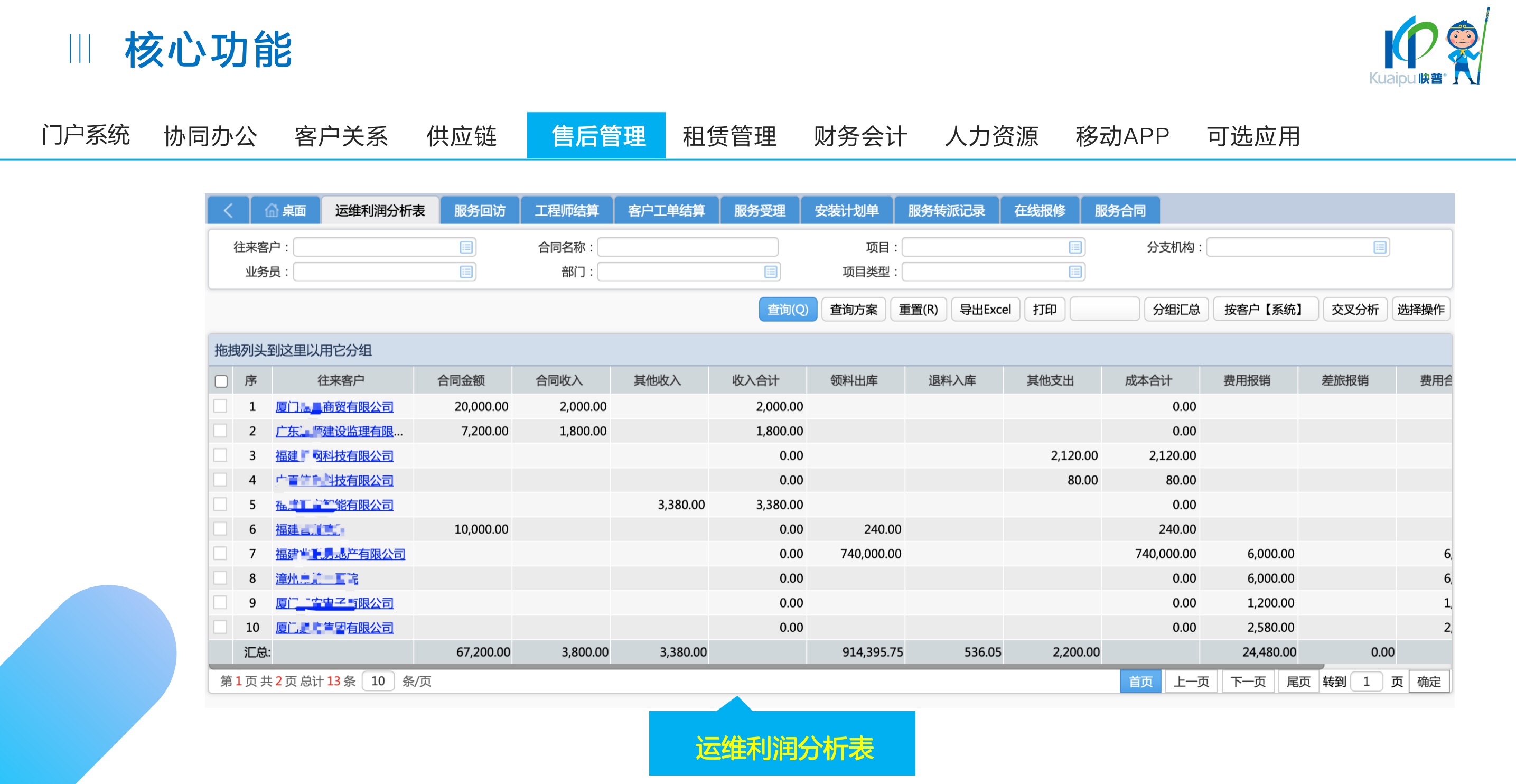 快普易30基于快普近20年在全國上萬家OA企業(yè)的實施與服務(wù)經(jīng)驗,融合了行業(yè)成功的管理智慧,以“客戶+機(jī)器”為中心提供數(shù)字化轉(zhuǎn)型解決方案,全面解決銷售、服務(wù)、租賃等多種業(yè)務(wù)模式的管理需求,以及企業(yè)經(jīng)營核算分析。