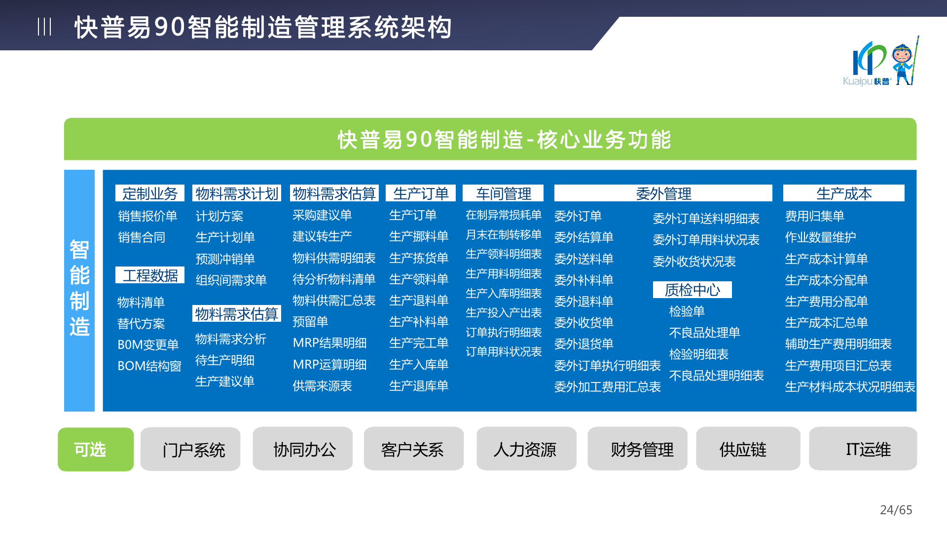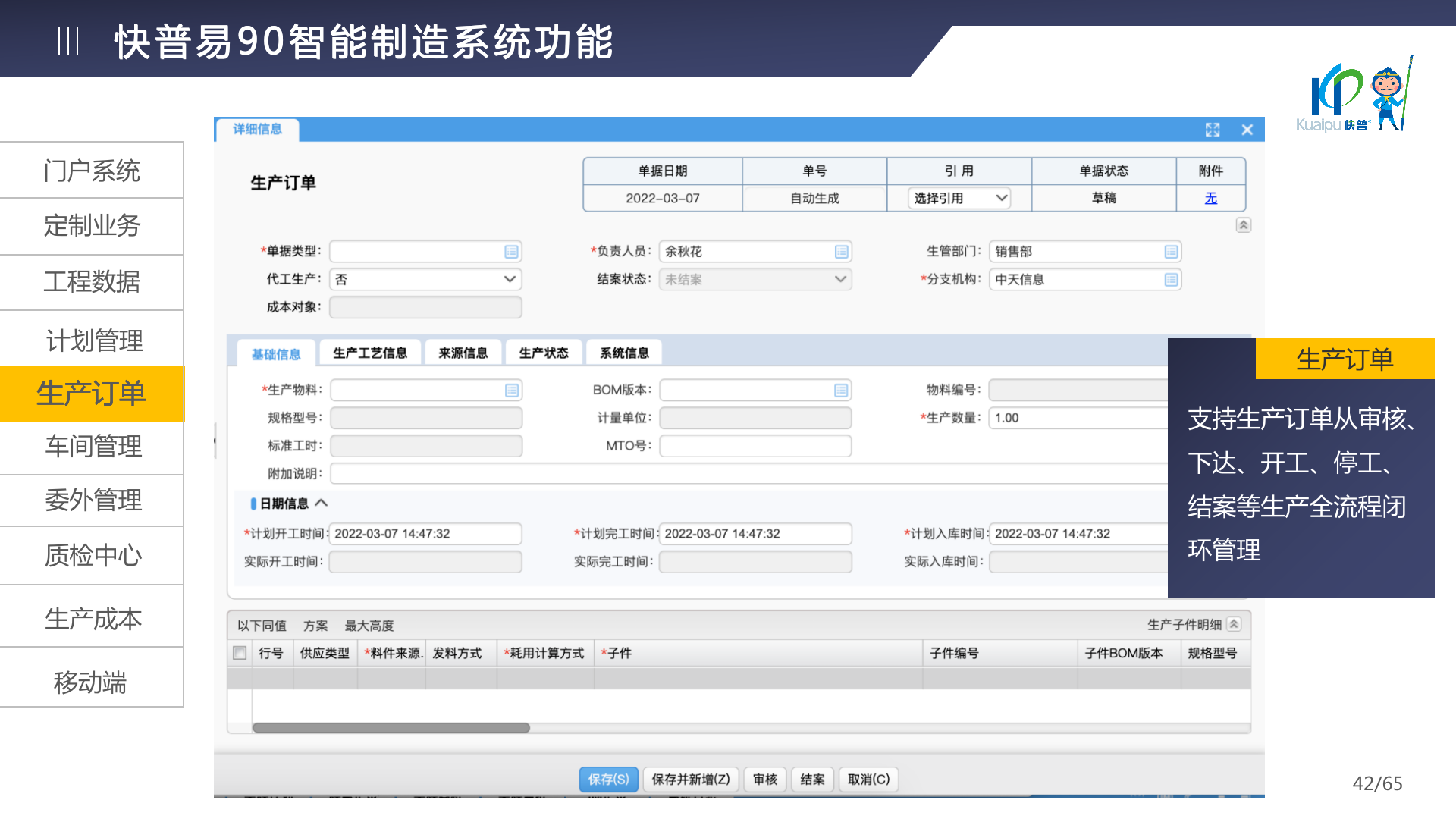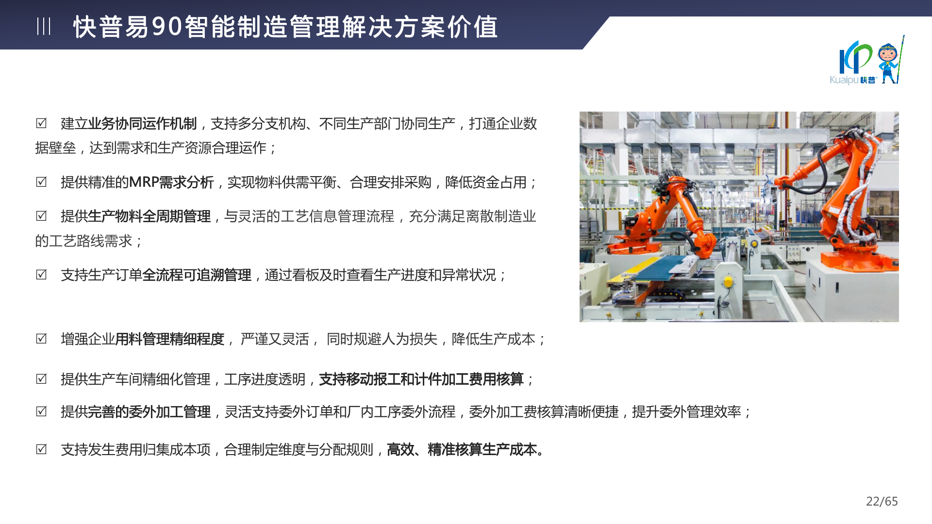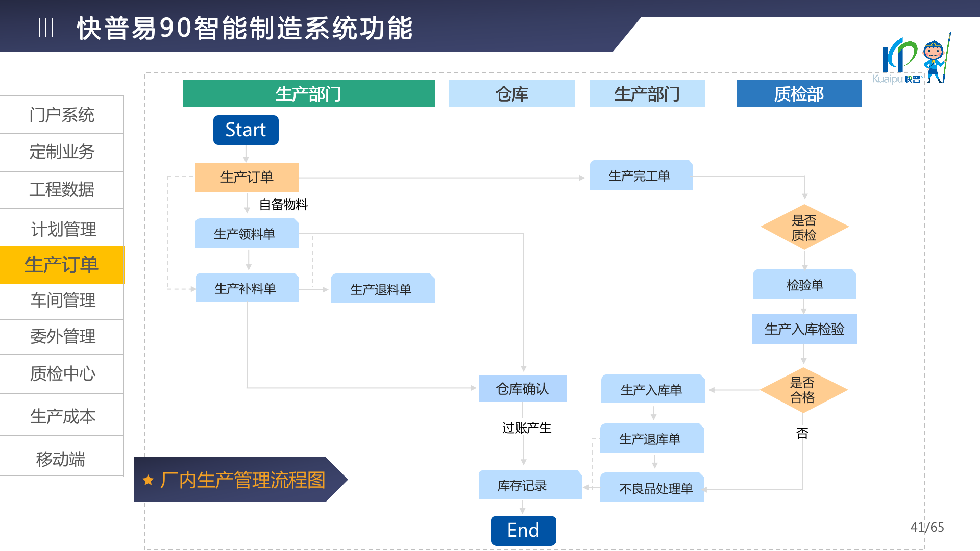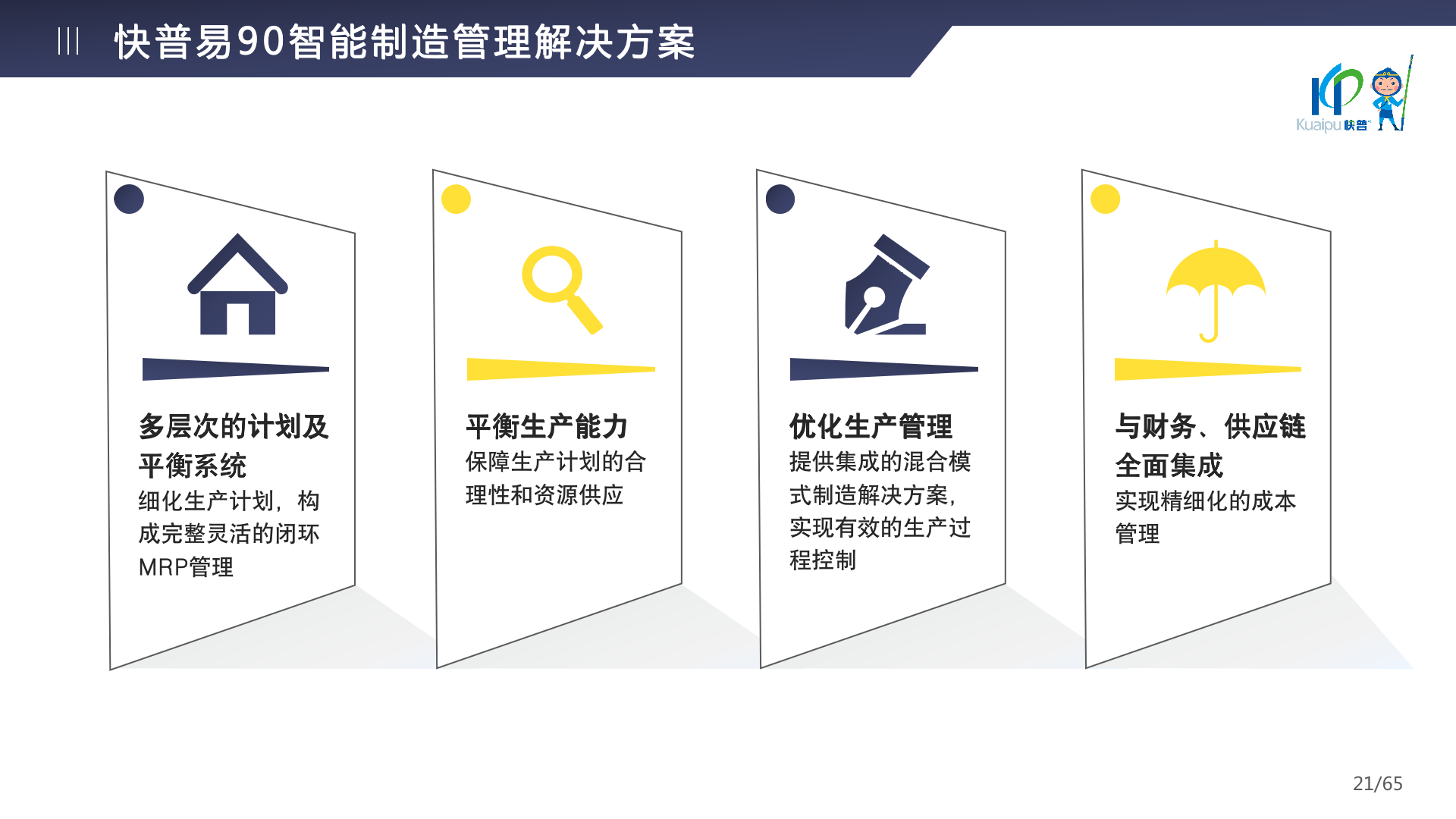 快普易90融合了大量精益生產(chǎn)管理的經(jīng)驗(yàn),涵蓋計(jì)劃管理、BOM管理、MRP運(yùn)算、生產(chǎn)訂單管理、供應(yīng)鏈管理、車間管理、出入庫管理、委外管理、質(zhì)量管理、生產(chǎn)成本核算、報(bào)表分析等全面生產(chǎn)管理,為企業(yè)打造實(shí)時(shí)感知變化、分析變化、提供決策的數(shù)字化管理平臺,推動(dòng)企業(yè)創(chuàng)新的管理,實(shí)現(xiàn)“智能制造”的數(shù)字化轉(zhuǎn)型。