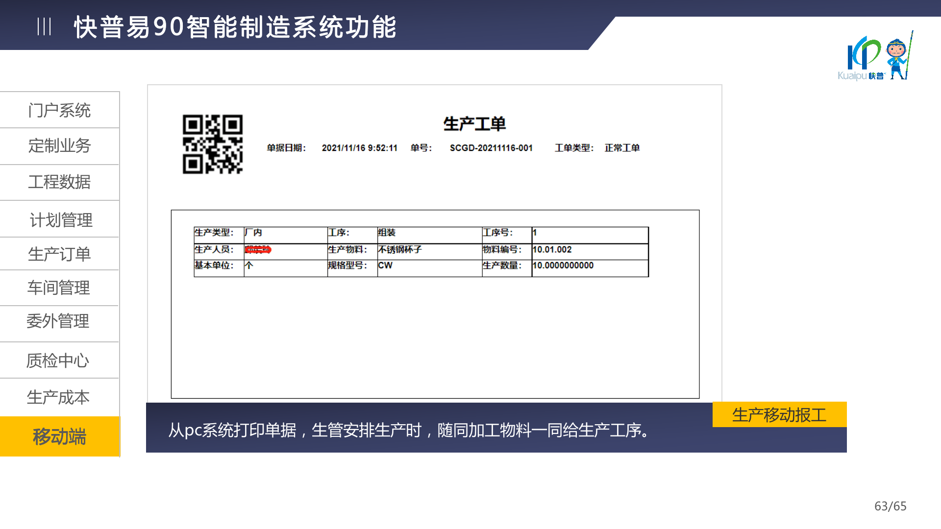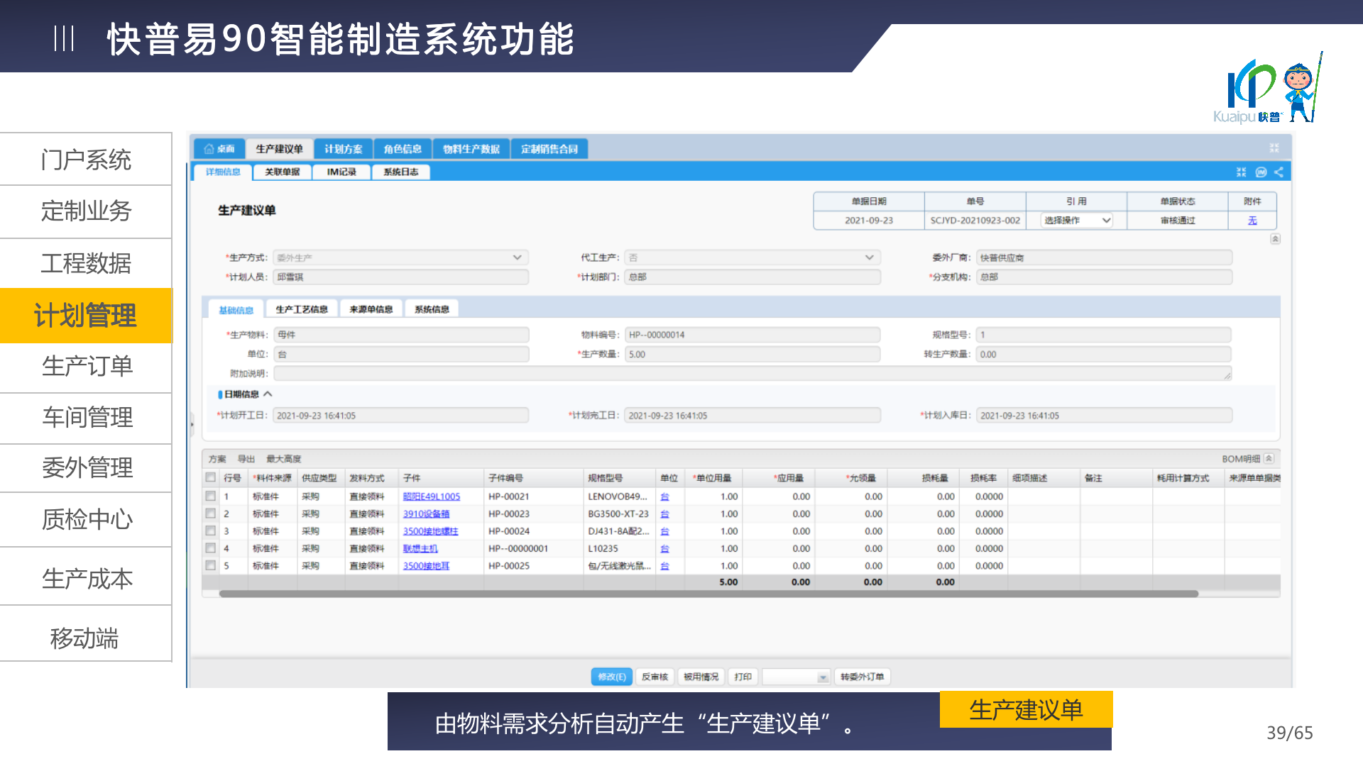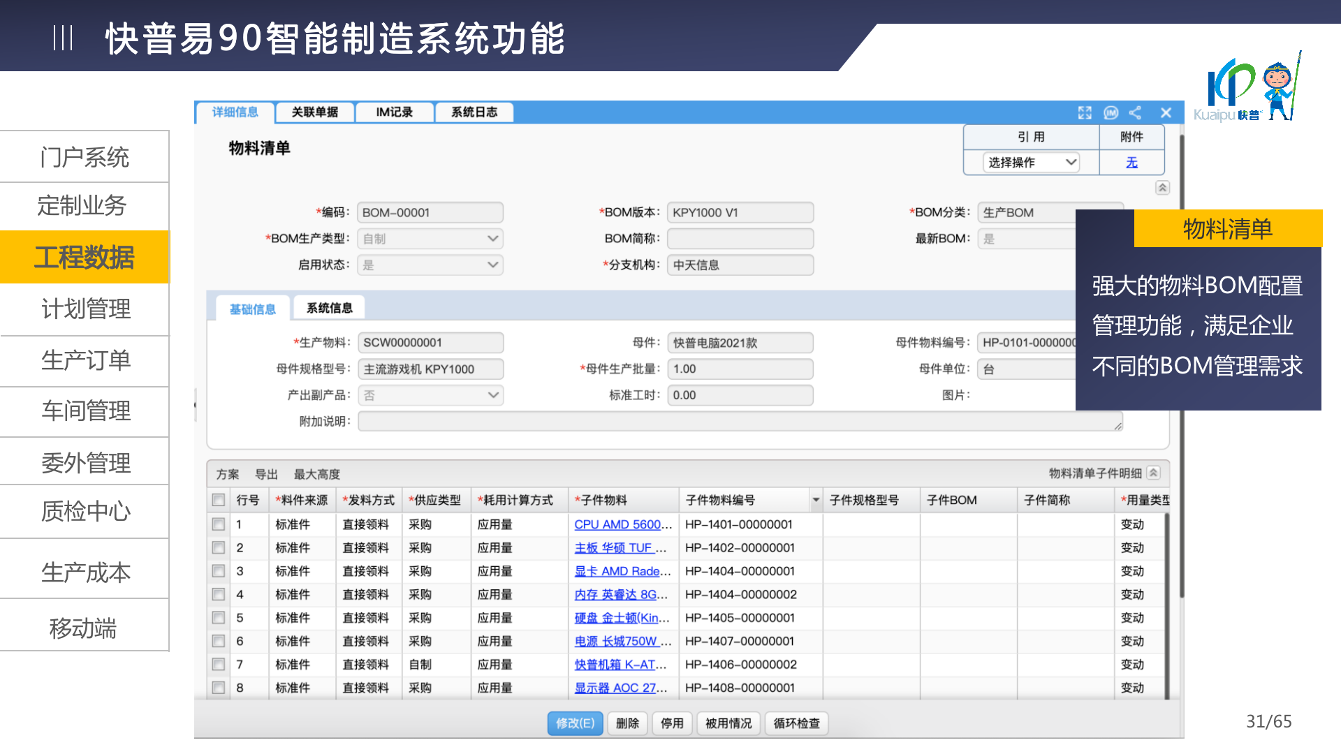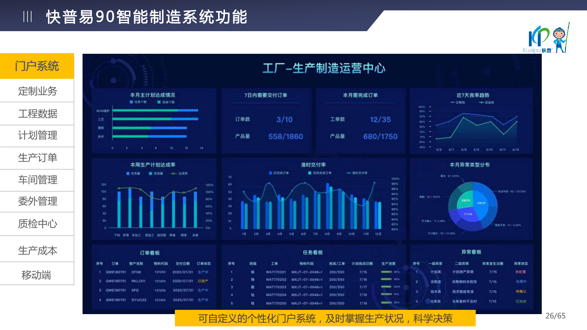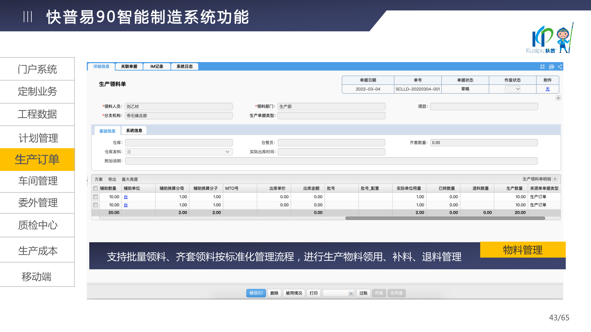 快普易90融合了大量精益生產(chǎn)管理的經(jīng)驗(yàn),涵蓋計(jì)劃管理、BOM管理、MRP運(yùn)算、生產(chǎn)訂單管理、供應(yīng)鏈管理、車間管理、出入庫管理、委外管理、質(zhì)量管理、生產(chǎn)成本核算、報(bào)表分析等全面生產(chǎn)管理,為企業(yè)打造實(shí)時(shí)感知變化、分析變化、提供決策的數(shù)字化管理平臺,推動(dòng)企業(yè)創(chuàng)新的管理,實(shí)現(xiàn)“智能制造”的數(shù)字化轉(zhuǎn)型。