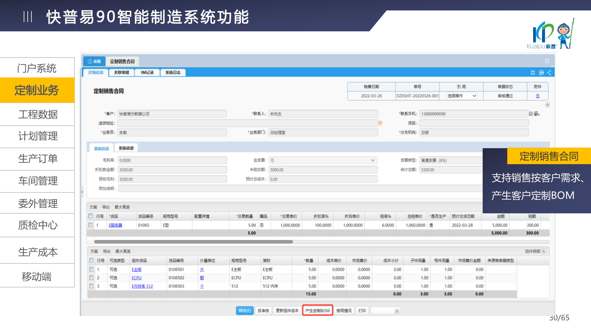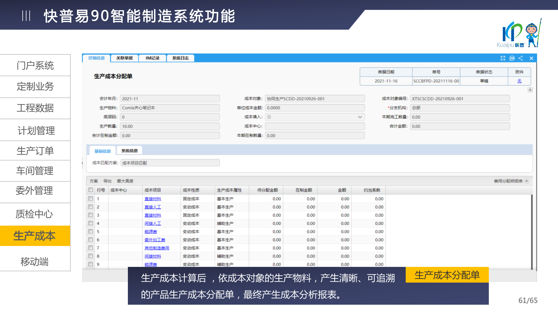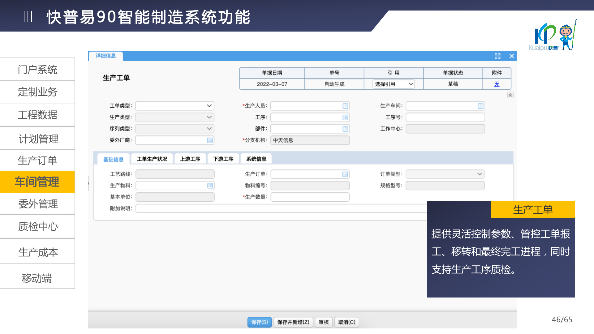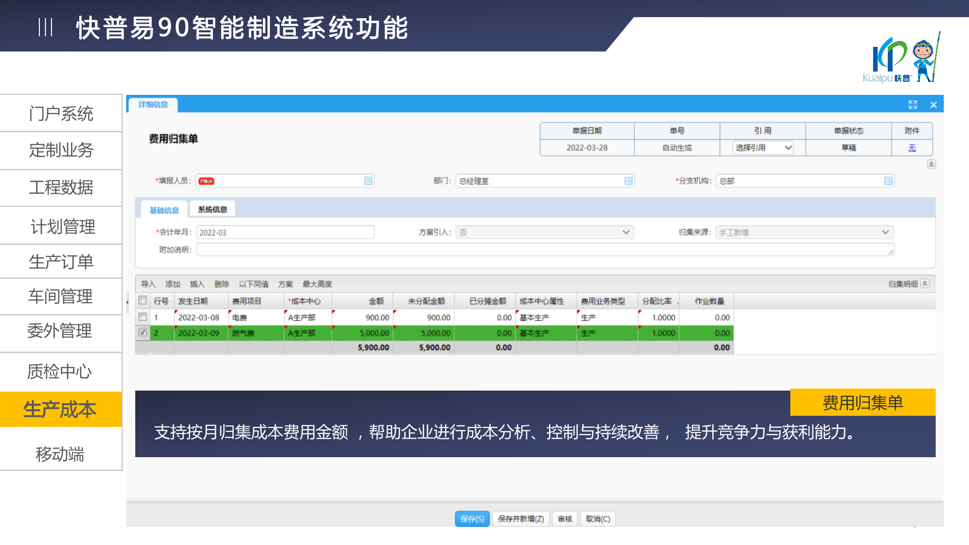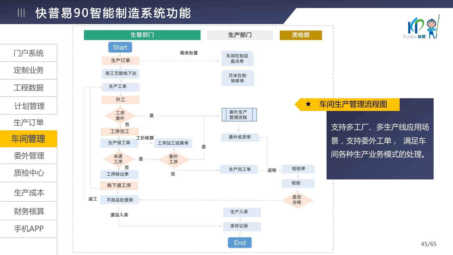 快普易90融合了大量精益生產(chǎn)管理的經(jīng)驗(yàn),涵蓋計(jì)劃管理、BOM管理、MRP運(yùn)算、生產(chǎn)訂單管理、供應(yīng)鏈管理、車間管理、出入庫管理、委外管理、質(zhì)量管理、生產(chǎn)成本核算、報(bào)表分析等全面生產(chǎn)管理,為企業(yè)打造實(shí)時(shí)感知變化、分析變化、提供決策的數(shù)字化管理平臺,推動(dòng)企業(yè)創(chuàng)新的管理,實(shí)現(xiàn)“智能制造”的數(shù)字化轉(zhuǎn)型。