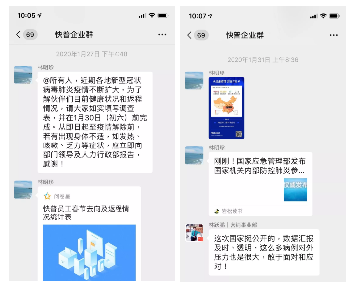 人力行政部快速啟動“快普公司疫情防控工作”,通過問卷登記、每日健康知識宣導、每日疫情發(fā)布,復工基本物資準備等一系列措施,全面關注員工動向及健康狀況,著力建設“平安快普”!