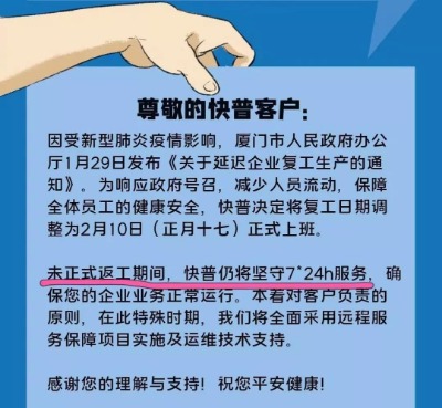 公司第一時間發(fā)布服務公告:未正式返工期間,快普將為客戶提供7*24h服務,客戶可通過遠程方式獲取運維及項目實施等服務。