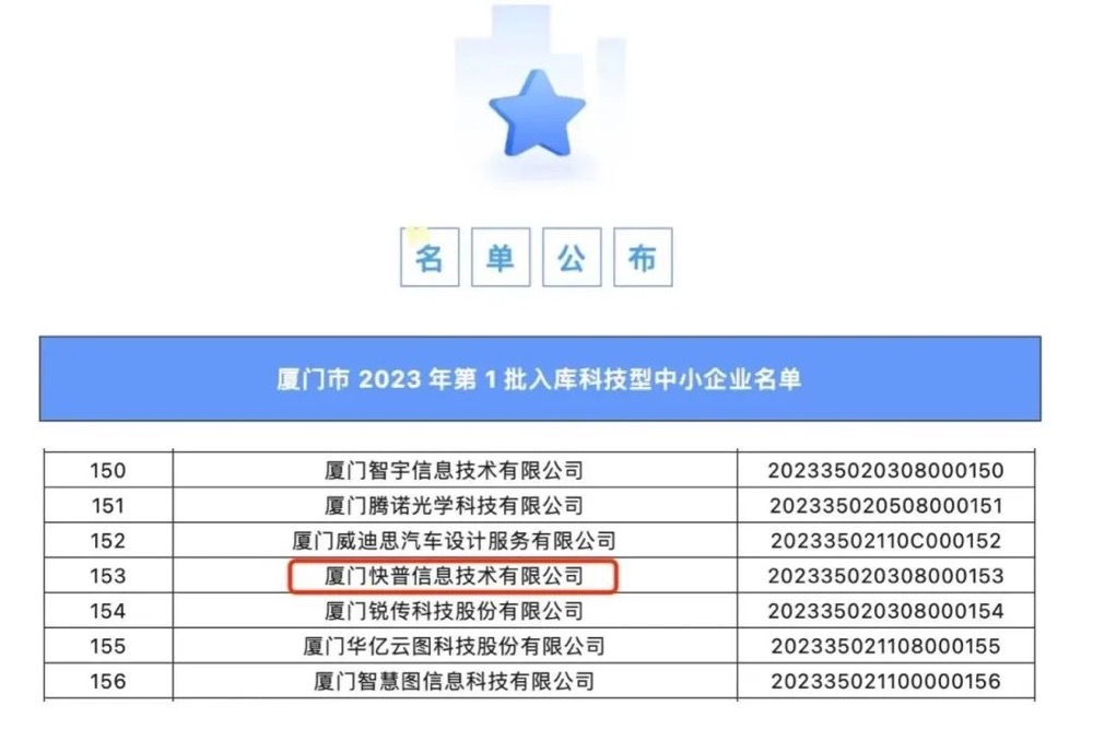 繼“廈門市創(chuàng)新型中小企業(yè)”認(rèn)定后,快普再傳捷報(bào)!近日,廈門市科技局發(fā)布了《2023年第一批入庫科技型中小企業(yè)名單》,快普赫然在列。該項(xiàng)評定意味著快普的技術(shù)成果、科技含量、創(chuàng)新能力等方面獲得了政府相關(guān)部門的充分肯定,同時(shí)也表明快普在科技創(chuàng)新、技術(shù)研發(fā)和知識(shí)產(chǎn)權(quán)保護(hù)方面邁上了一個(gè)新的臺(tái)階。