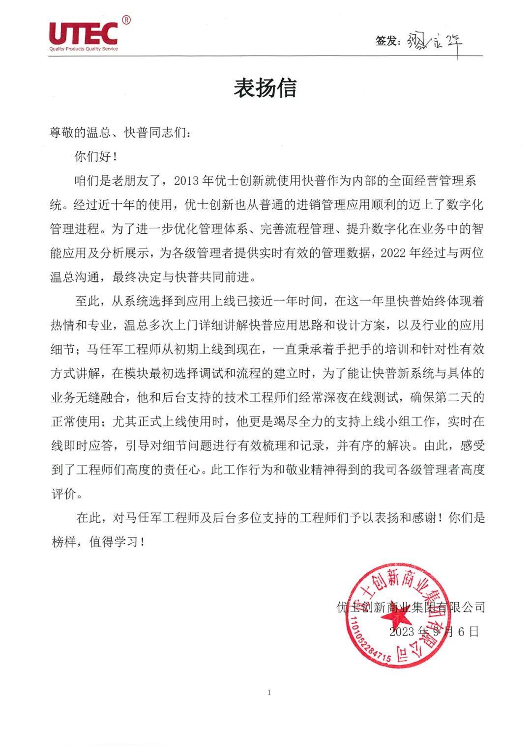 【簡(jiǎn)訊】老客戶優(yōu)士創(chuàng)新商業(yè)集團(tuán)有限公司(以下簡(jiǎn)稱“優(yōu)士創(chuàng)新”)向我司發(fā)來感謝信,對(duì)快普的平臺(tái)、產(chǎn)品和團(tuán)隊(duì)服務(wù)給予了高度肯定,并特別對(duì)實(shí)施工程師馬任軍的專業(yè)、敬業(yè)及高度責(zé)心提出了表揚(yáng)和贊賞。